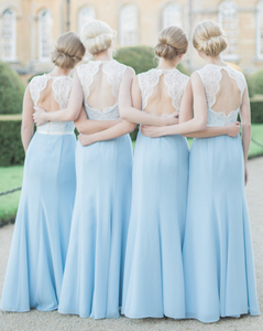 Sky Blue Two Piece Bridesmaid Dresses Cap Sleeves Lace Top