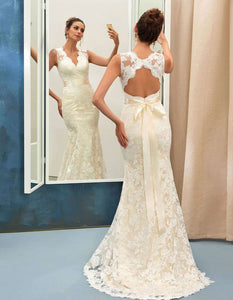 V Neck Mermaid Lace Wedding Dresses Bridal Gown with Sash