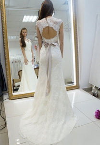V Neck Lace Open Back Wedding Dresses Bridal Gown with Sash