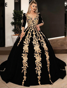 V Neck Black Prom Dresses with Sleeves with Gold Embroidery