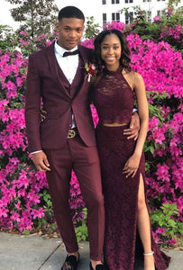 High Neck Lace Two Piece Prom Dresses with Slit Side  - Precio habitual