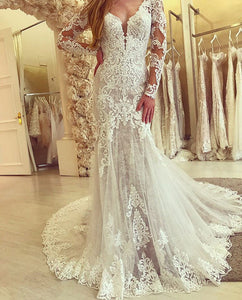 V Neck Lace Wedding Dresses Bridal Gown with Full Sleeves