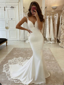 Mermaid V Neck Wedding Dresses Bridal Gown with Lace
