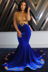 High Neck Royal Blue Prom Dresses with Gold Appliques