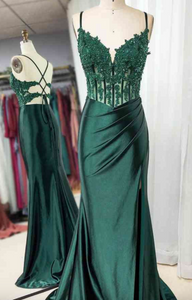 Green Prom Dresses Spaghetti Straps with Appliques Lace