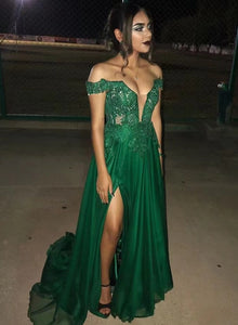 Off Shoulder Green Prom Dresses with Lace Slit Side