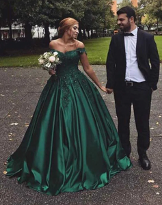 Off Shoulder Green Prom Dresses Appliques Lace Princess Gown