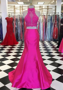 High Neck Fuchsia Prom Dresses with Appliques Lace