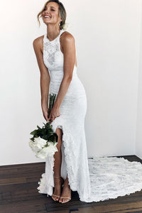 High Neck Lace Slit Front Wedding Dresses Bridal Gown
