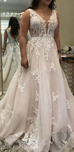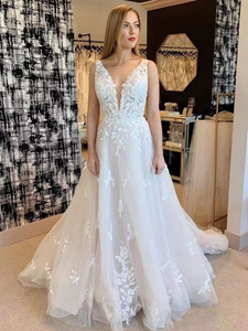 V Neck Wedding Dresses Bridal Gown with Lace Appliques