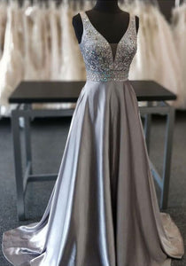 V Neck Gray Long Prom Dresses Evening Dress with Beaded